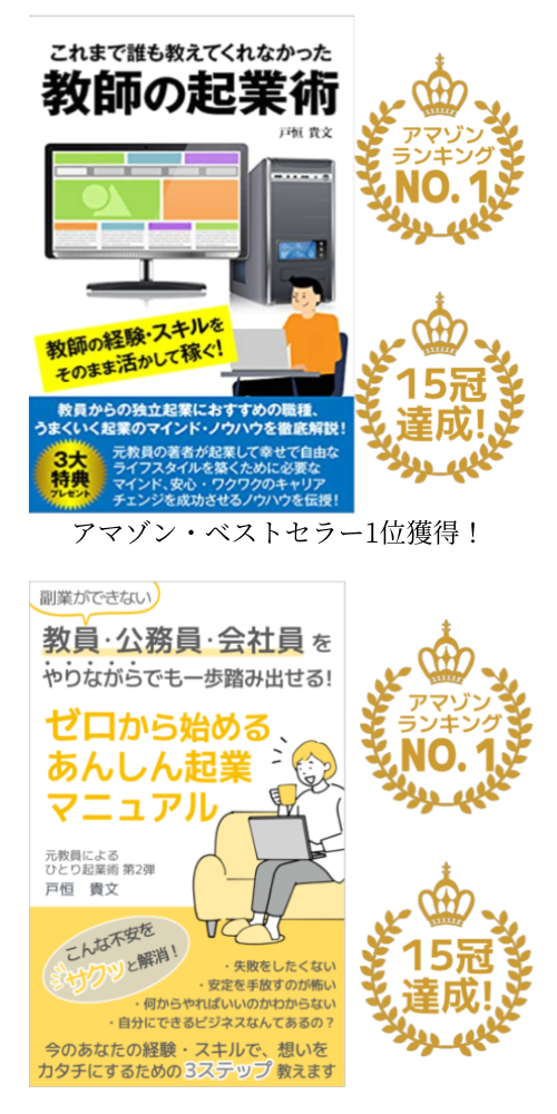 著書『これまで誰も教えてくれなかった教師の起業術』はAmazon Kindleランキングで15冠・ベストセラー1位を獲得、2冊目の『ゼロからあんしん起業マニュアル』も15冠を達成する。